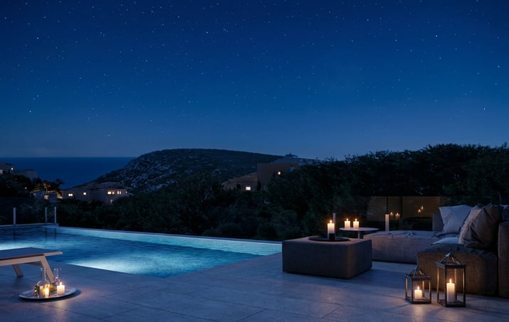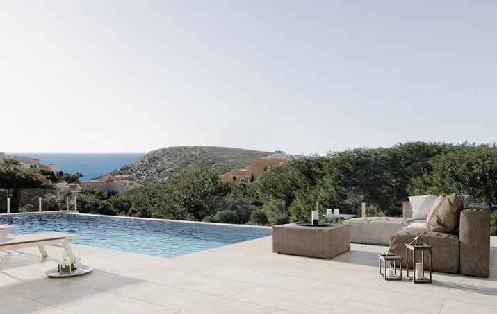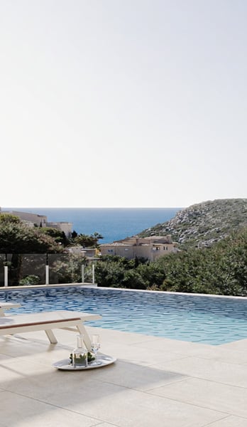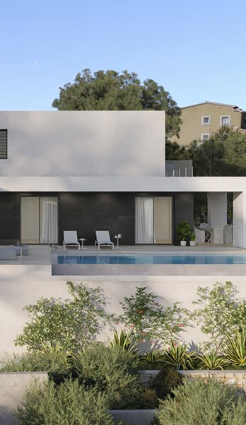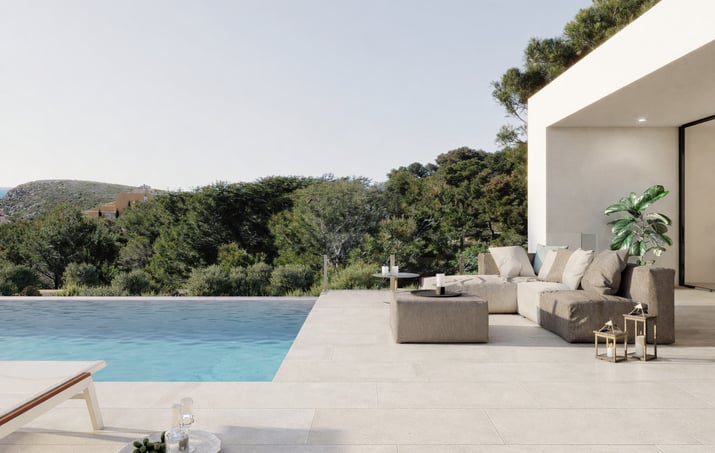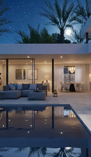 El exterior del chalet de lujo es un paraíso de relax. La terraza principal alberga una piscina infinita, perfecta para disfrutar del clima mediterráneo, rodeada de zonas de descanso y un jardín cuidadosamente diseñado que proporciona privacidad y conexión con la naturaleza, además de un gran porche con zona de barbacoa para disfrutar de comidas.