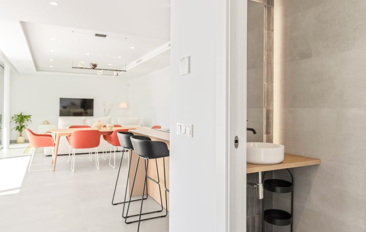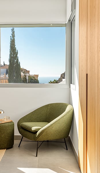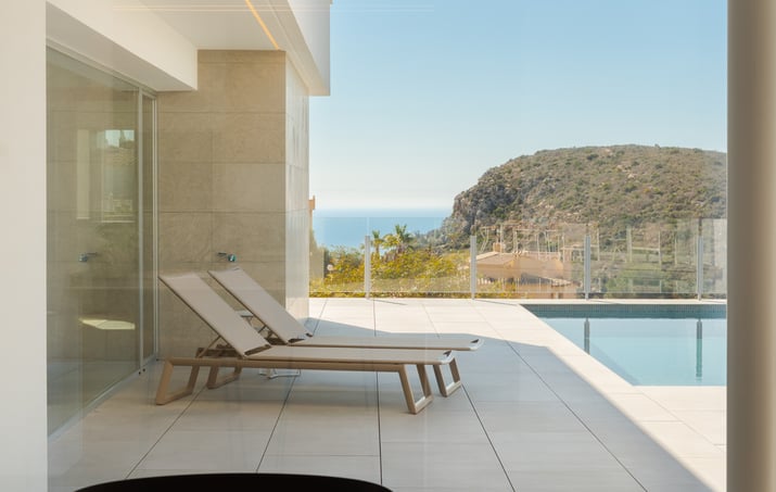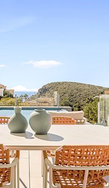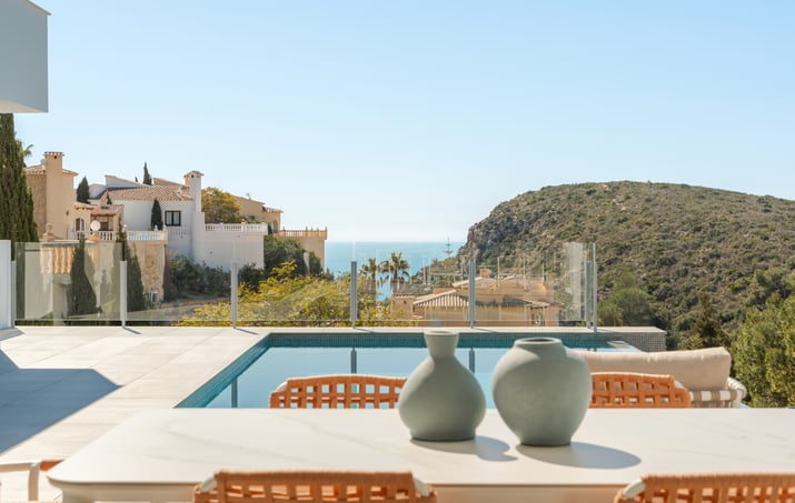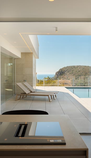 Villa Nara, una villa con piscina privada en Cumbre del Sol con un concepto claro, crear una fusión entre el interior y el exterior, obteniendo estancias abiertas, luminosas y funcionales. El salón invade la terraza e invita a poder disfrutar del maravilloso clima mediterráneo, que nos brinda prácticamente 300 días de sol al año.