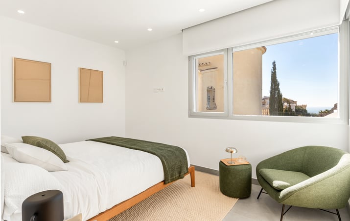 Villa Nara se divide en dos alturas. En la planta principal se distribuye toda la vivienda, con la comodidad que aporta tenerlo todo en un mismo nivel, una villa optima para los que no quieren escaleras. Tres dormitorios, todos ellos dobles, además el dormitorio principal dispone de baño en suite y acceso directo a la terraza. El salón comedor y la cocina destacan por su distribución abierta, sus grandes dimensiones y la comunicación con la zona exterior, ya que Villa Nara dispone de piscina privada, una gran terraza con unas vistas abiertas al mar preciosas.